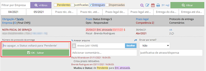01) Agora o Acessórias tem a opção de voltar o status dos prazos que exigem entrega pelo e-Contínuo para pendente sem precisar desativar a exigência no cadastro da obrigação: