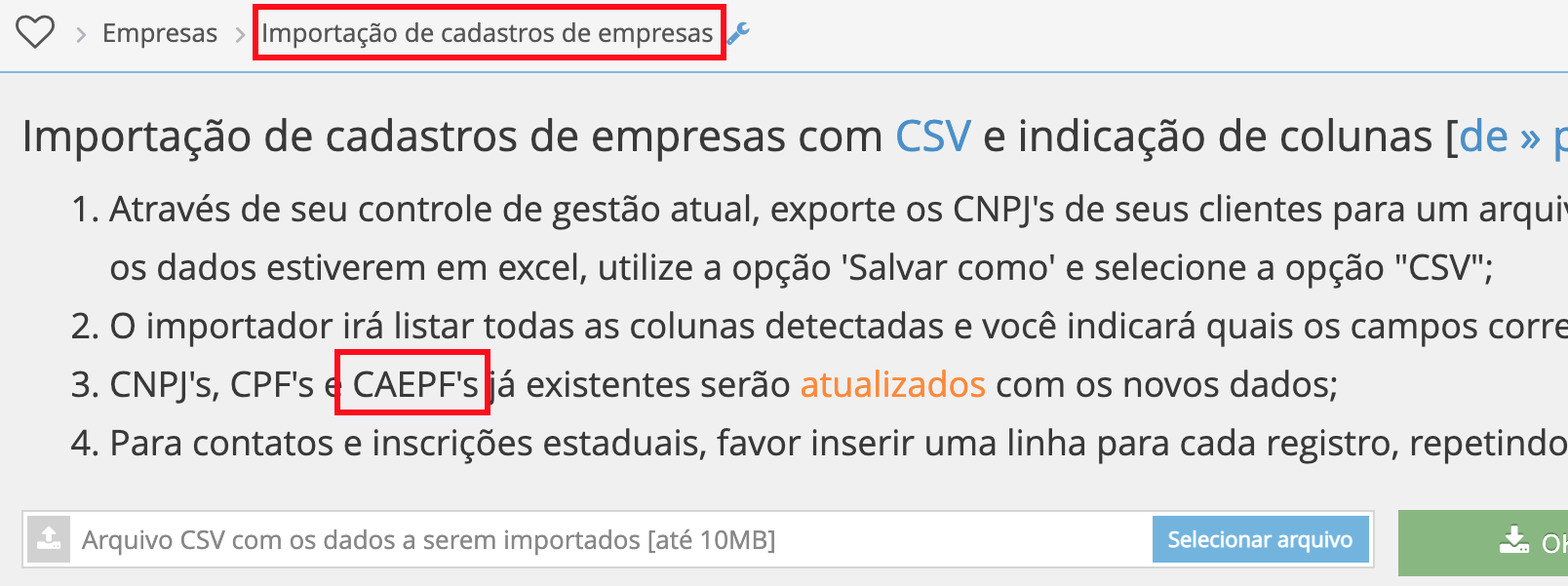 Agora a importação de empresas por arquivo .CSV também aceita registros que usam o CAEPF como chave principal!