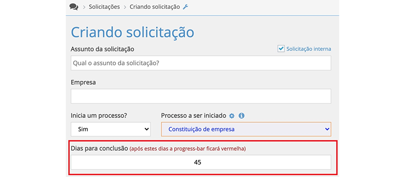 Na abertura da solicitação, no campo "Dias para a conclusão" defina quantos dias após o início do processo a barra de progresso ficará vermelha: