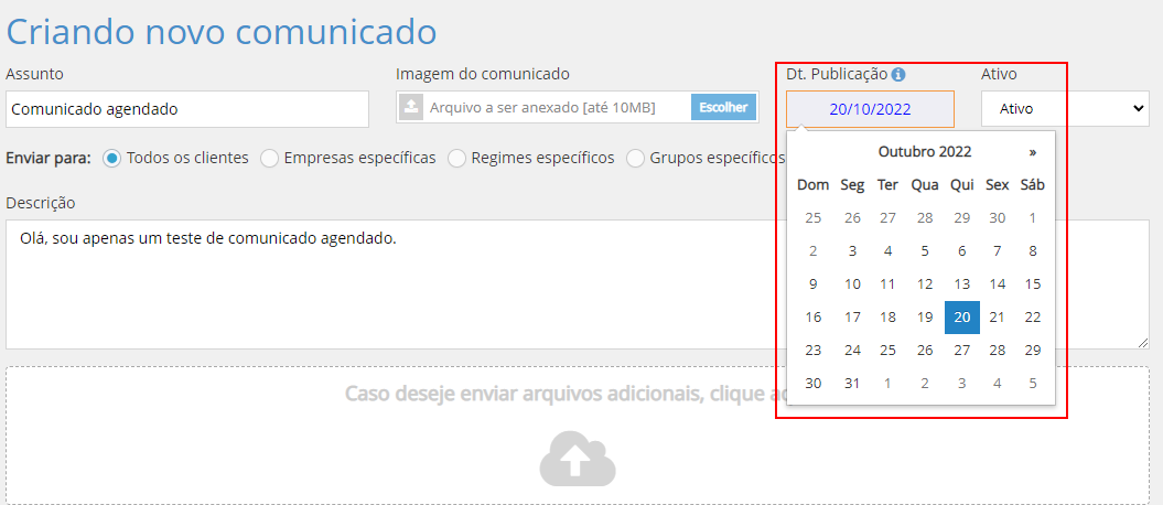 - No campo Dt. da publicação, defina a data na qual deseja publicar o comunicado.