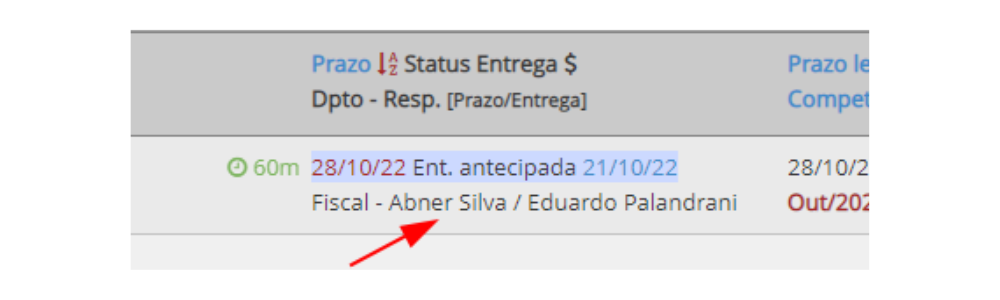 Pensando em otimizar essa visualização, disponibilizamos para a próxima versão esta visualização. Agora, nas entregas em que o responsável pelo prazo é diferente do responsável pela entrega, ambos os responsáveis serão exibidos na lista de entregas e nos relatórios em PDF onde essa informação é apresentada.