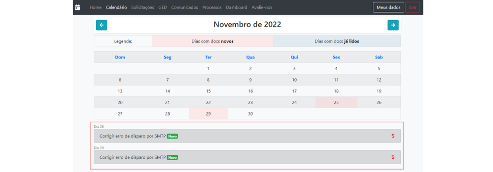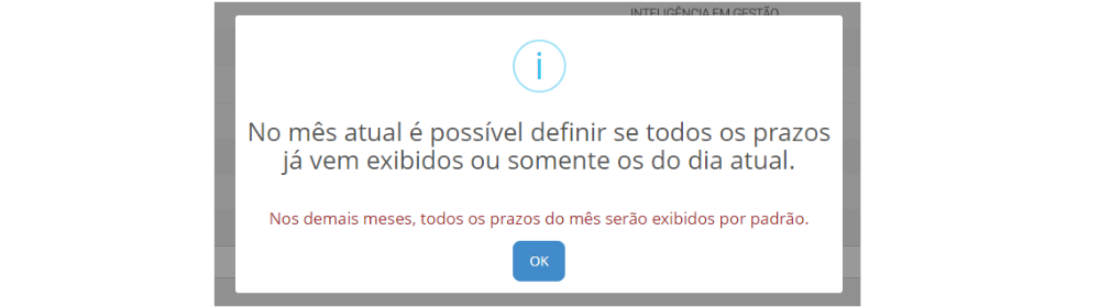 Nos demais meses (futuros ou passados), ao abrir o mesmo serão listados todos os prazos do mês. Ao selecionar um dia específico, os prazos do dia serão exibidos como já acontecia (em todos os meses).
