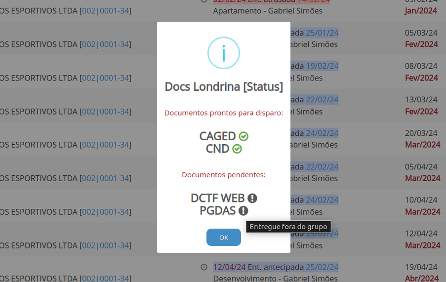 Ao clicar no ícone de envio agrupado da Lista de Entregas, será possível verificar quais documentos já estão prontos para disparo (que já foram enviados pelo robô ou pela lista de entregas) e quais ainda estão pendentes para o e-mail ser enviado, proporcionando uma melhor visualização e coordenação no envio.