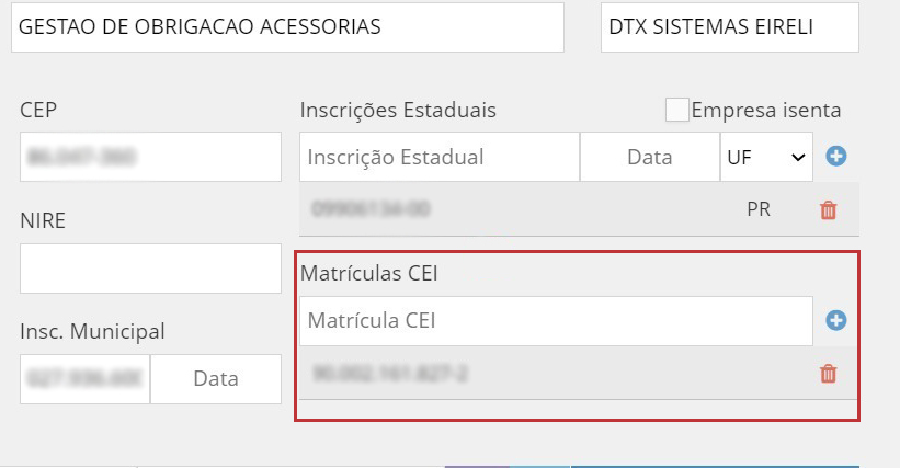 No cadastro de empresas foi inserido um novo campo para o cadastro das Matrículas CEI. Este campo fica abaixo do cadastro das Inscrições Estaduais.