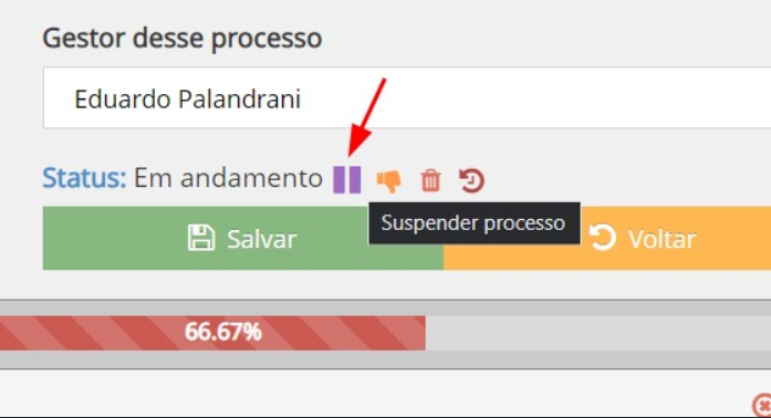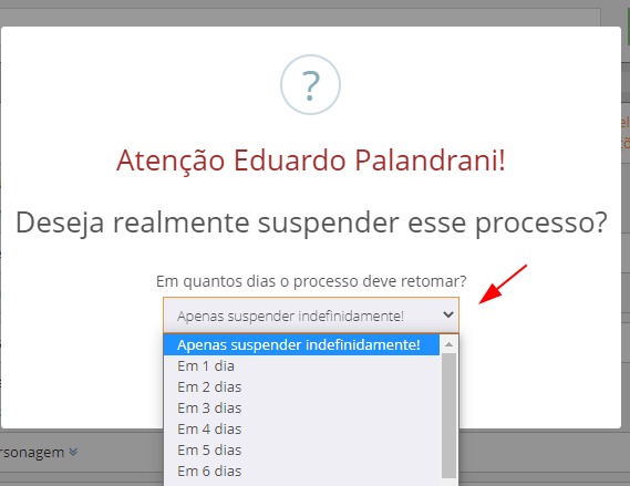Ao clicar para no ícone Suspender processo, você poderá deixar a opção padrão "Suspender indefinidamente" ou definir em quantos dias o processo deverá ser retomado.