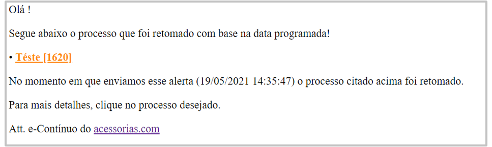 Quando um processo (ou vários) forem retomados automaticamente, um e-mail será disparado para o responsável, agrupando os processos retomados:
