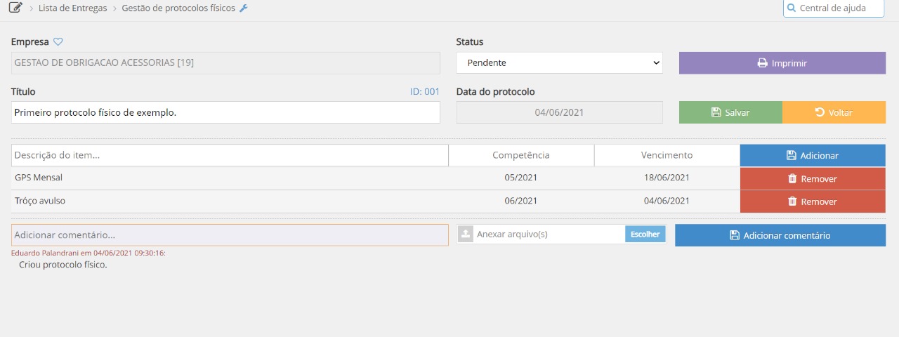 Importante: Você poderá inserir comentários e anexos, caso queira documentar o protocolo depois de entregue/assinado.