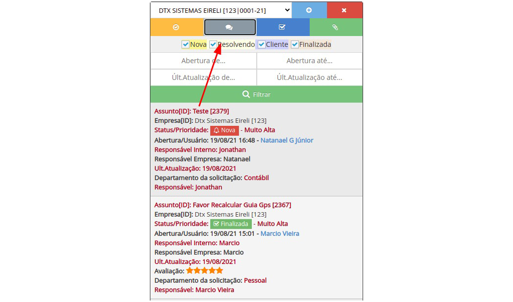 Para filtrar as solicitações direto na integração, basta acessar o botão indicado na tela abaixo: