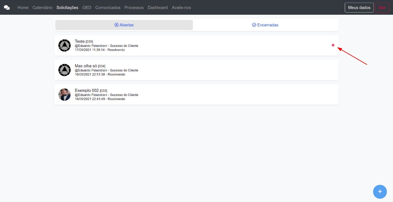 Ao acessar o menu Solicitações, a solicitação que possuir interações não vistas também será sinalizada com um bubble, facilitando a identificação do cliente: