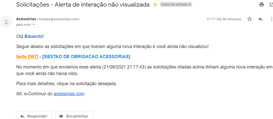 Além das notificações dentro da Área VIP, seu cliente também será notificado por e-mail sobre as interações de solicitações que ainda não foram visualizadas. O e-Contínuo enviará e-mails periodicamente ao longo do dia, lembrando o seu cliente de acessar as solicitações que tiveram alguma interação e que ainda não foi visualizada.