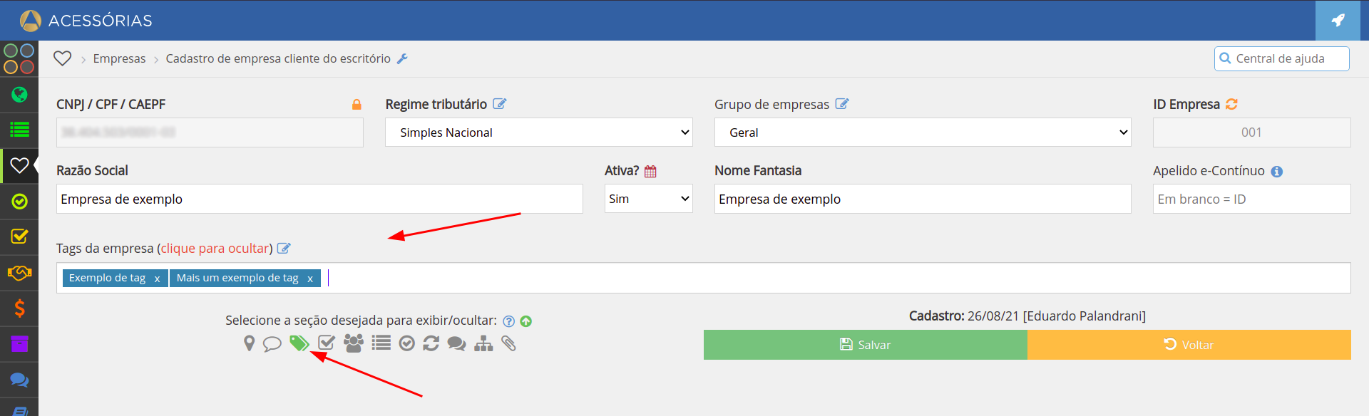 Exemplo: Você pode criar Tags para agrupar tipos específicos de empresas, como todas as "Empresas de TI do Simples nacional" ou "Empresas de Comércio do Lucro presumido" ou "Somente as entregas de empresas de Prestadores de serviço que são do MEI".