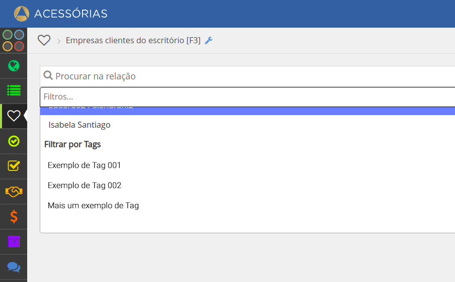 São infinitas possibilidades de filtros que podem ser aplicados a partir de segmentações de informações relevantes. Para isso, basta adicionar as Tags desejadas nas empresas para depois agrupá-las por meio dos filtros disponíveis nas telas, relatórios e Dashboards do sistema.