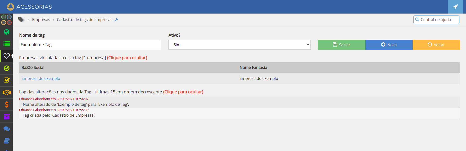 É possível consultar o histórico de alteração das Tags através do Log de alteração de dados, no mesmo padrão dos demais Logs existentes no sistema: