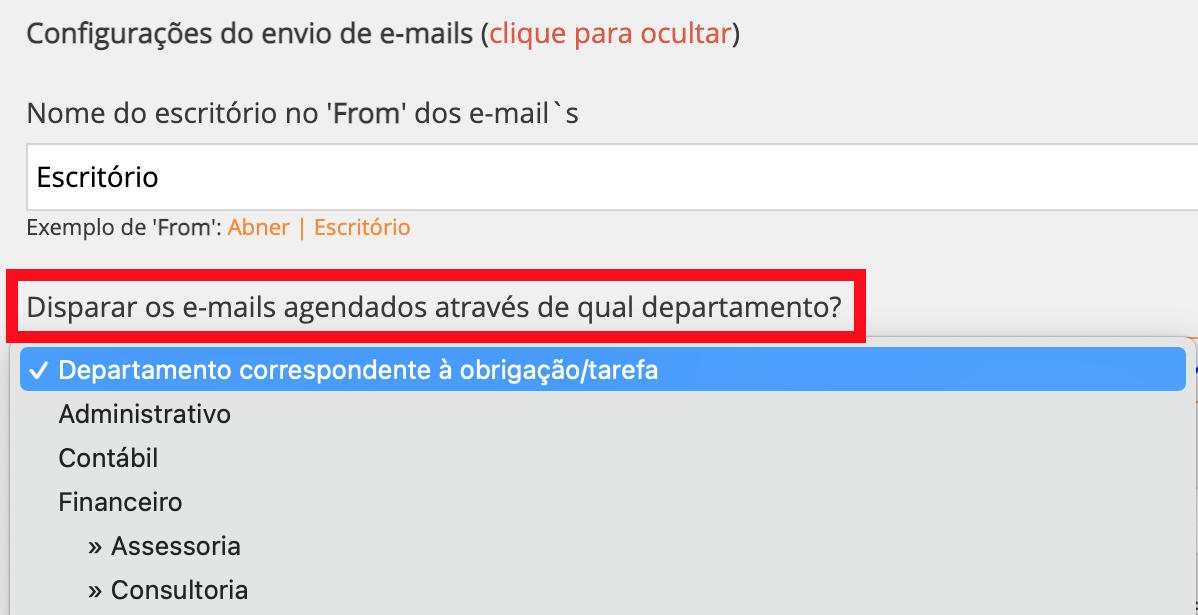 Mais uma novidade nas configurações do sistema: agora é possível escolher que todos os e-mails agendados saiam de um único departamento.
