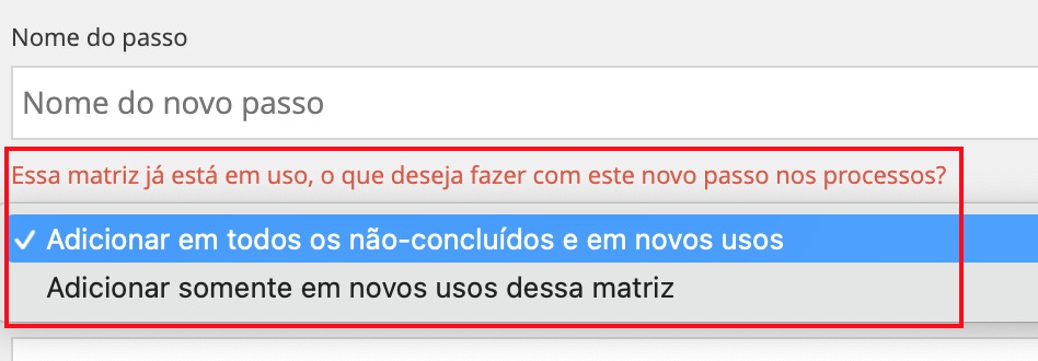 Em outras palavras, isso significa que ao criar um novo passo em uma matriz em uso, o Acessórias irá perguntar se você deseja aplicar este novo passo somente em novos usos da matriz ou se gostaria de adicioná-lo aos processos que já estão em andamento (somente os não-concluídos).