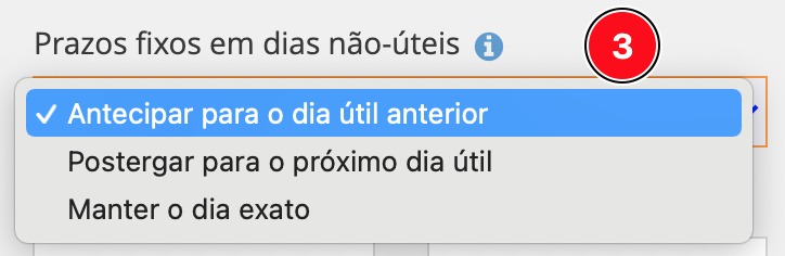 Agora você pode definir qual será o comportamento do sistema quando um prazo de entrega do tipo "dias fixos", (por exemplo: todo dia 10) cair em um feriado ou fim de semana.